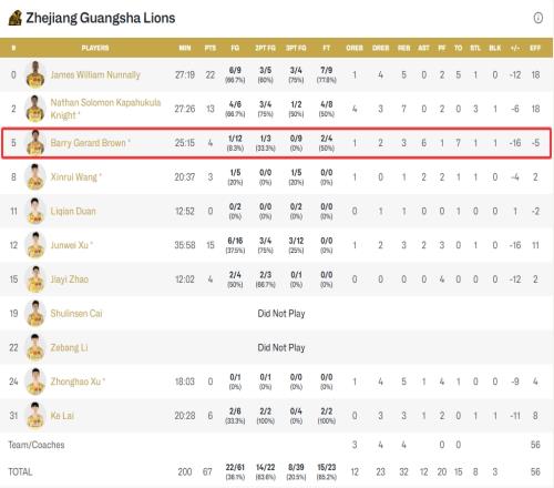 本场比赛,CBA总决赛MVP小巴里-布朗表现不佳,他12投1中,三分9中0,罚球4中2,得到4分3篮板6助攻7失误1抢断1盖帽,正负值-16。